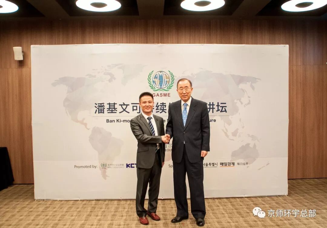 董事长朱雪峰先生,在会议期间受到潘基文先生亲切接见交谈,并单独合影留念。随后董事长又作为杰出代表在大会上发言,发言主题《弘扬中华文化,有力推动全球可持续发展》,董事长主题鲜明、内容充实、措辞得力、铿锵有力的演讲,获得了潘基文秘书长的高度赞扬和与会代表的一致好评,会场掌声雷动。这件事件不仅是国家对我们京师事业的充分肯定,也是联合国对我们京师事业的充分肯定,不仅是董事长的骄傲,更是我们全体京师人的骄傲和最高荣耀,我们全体京师人要以这次荣耀为动力,再创佳绩,为中华文化的推广做出更大的贡献。